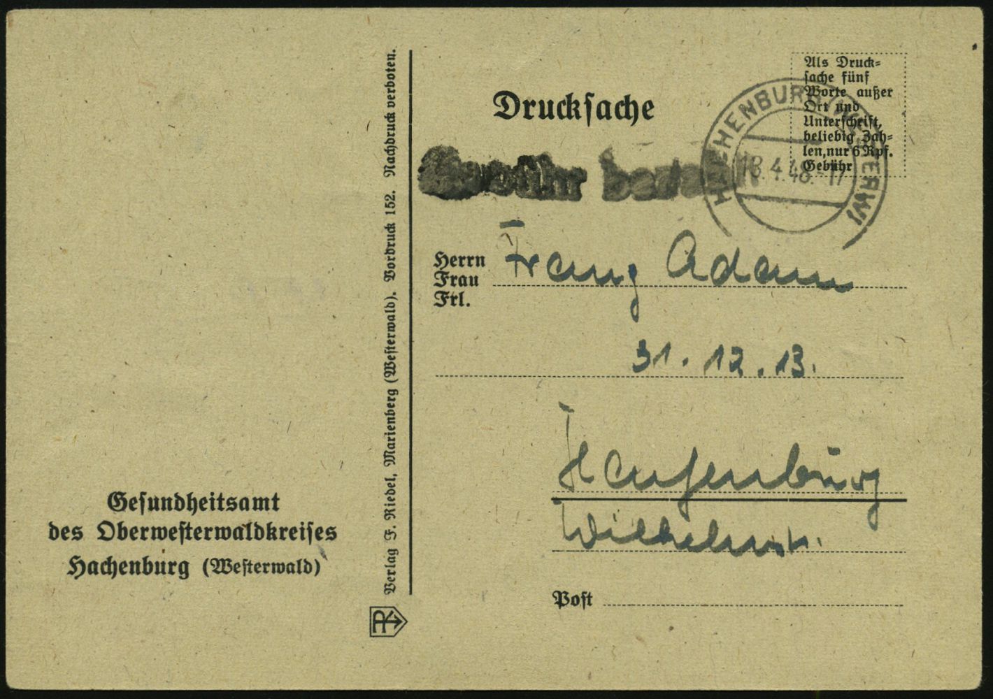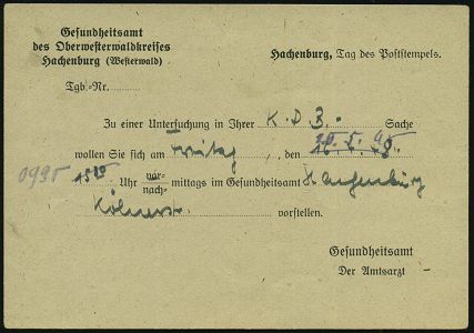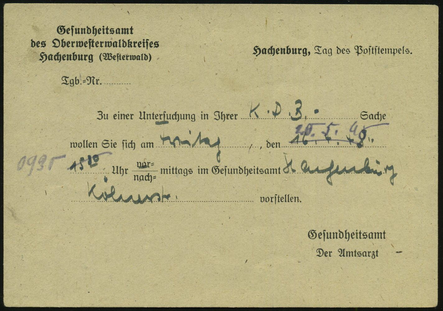 9741 | 18 € | PL-Raum 52 : HACHENBURG (WESTERW) 1948 (13.4.) 2K-Steg + schw. 1L: Gebühr bez., Dienst-Kt: Gesundheitsamt.. Hachenburg , Vorladung: K.D.B.-Untersuchung.., seltene Barfrankatur | ![]() ![]() | |