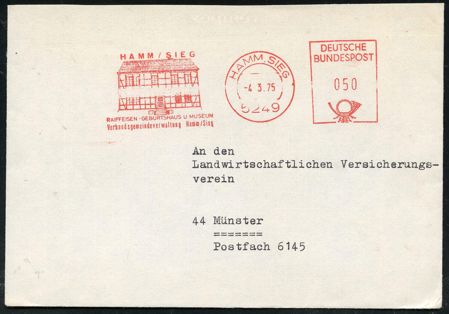 9748 | 12 € | PL-Raum 52 : 5249 HAMM,SIEG/ RAIFFEISEN-GEBURTSHAUS U.MUSEUM.. 1975 (4.3.) AFS Postalia (Raiffeisen-Museum) Fernbf. (Dü.E-26B) | ![]() | |