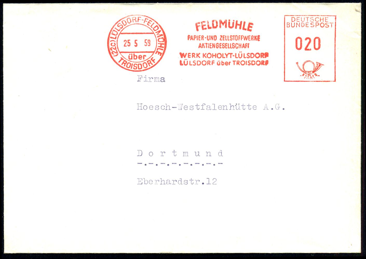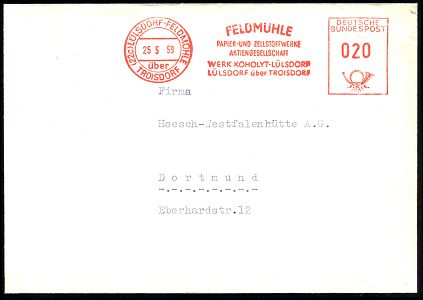 9756 | 16 € | PL-Raum 52 : (22c) LÜLSDORF - F E L D M Ü H L E / über/ TROISDORF/ FELDMÜHLE/ PAPIER-U.ZELLSTOFFWERKE/ AG/ WERK KOHOLYT-LÜLSDORF 1959 (21.7.) AFS Francotyp = Hauspostamt Feldmühle! (= Papiermühle) rs. dekorativer Abs.-Vordruck, Fern-Bf. (Dü.E-23CO = PSt. I) | ![]() | |