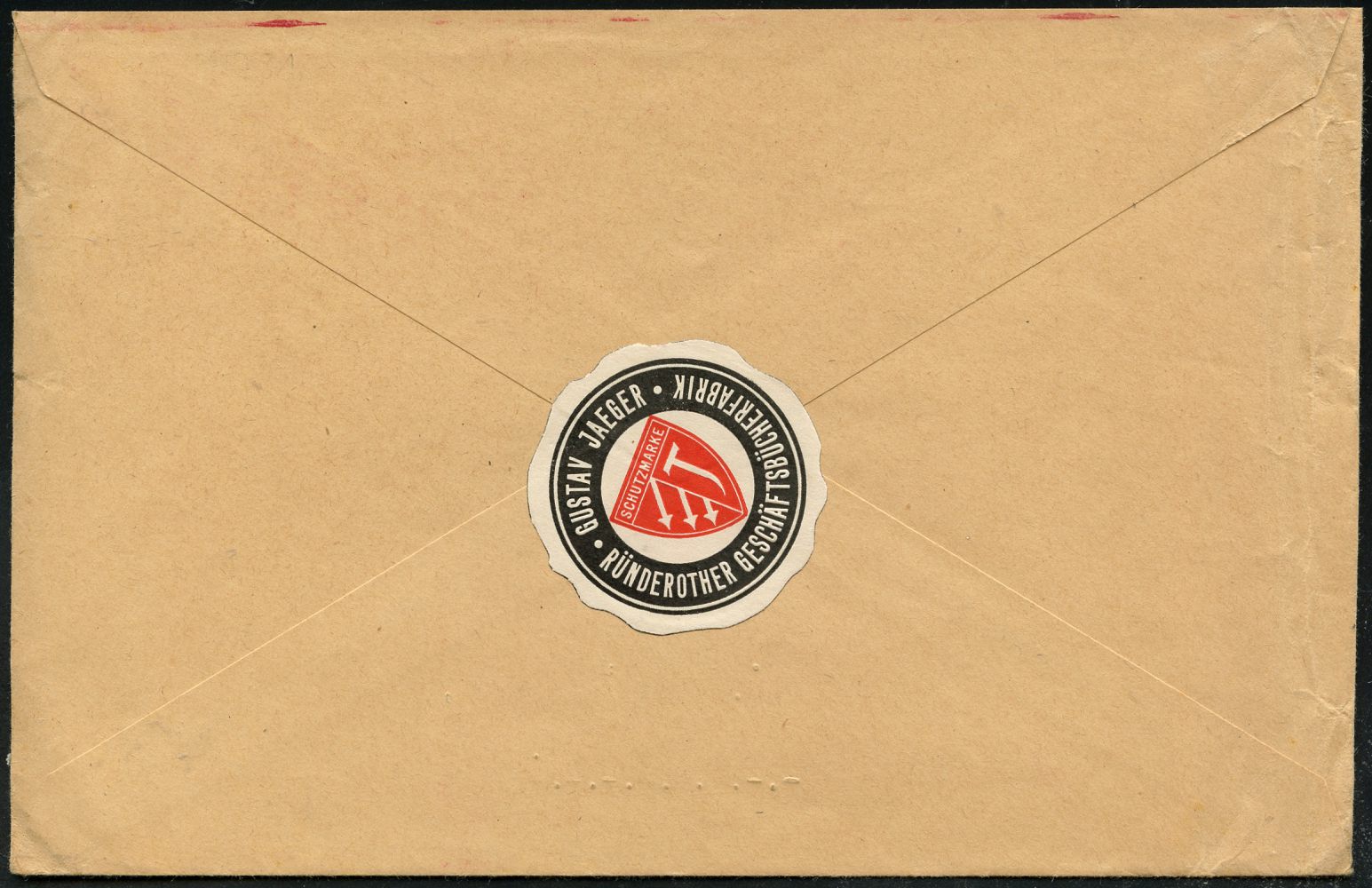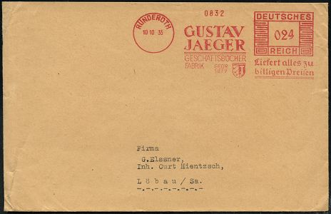 9767 | 20 € | PL-Raum 52 : RÜNDEROTH/ GUSTAV/ JAEGER/ GESCHÄFTSBÜCHER/ FABRIK/ GEGR./ 1879.. 1935 (10.10.) AFS Francotyp "Mäanderrechteck" (Wappen) klar gest. Fern-Bf., rs. dekorative Firmen-Verschlußoblate (Dü.E-2CEh) | ![]() ![]() | |