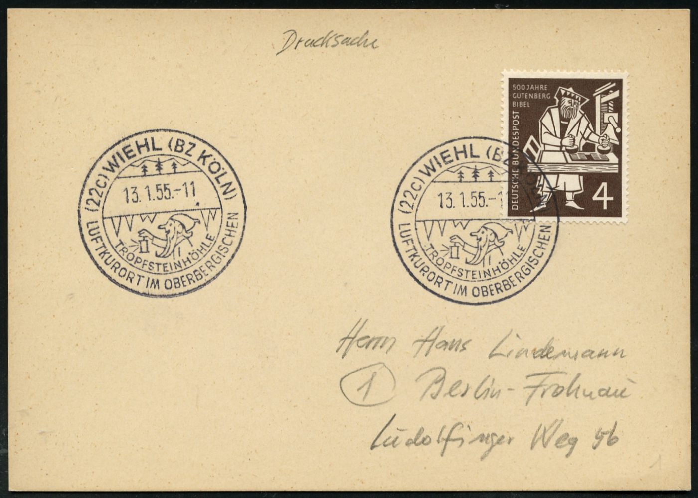 9785 | 18 € | PL-Raum 52 : (22c) WIEHL (BZ KÖLN)/ TROPFSTEINHÖHLE.. 1955 (13.1.) HWSt (Zwerh mit Laterne in Topfsteinhöhle) EF 4 Pf. Gutenbg. (Mi.198, EF + 30.-EUR) Inl.-Drs.-Karte (Bo.1) | ![]() | |