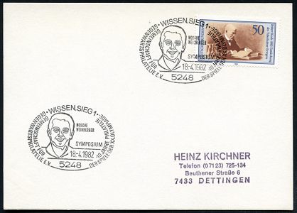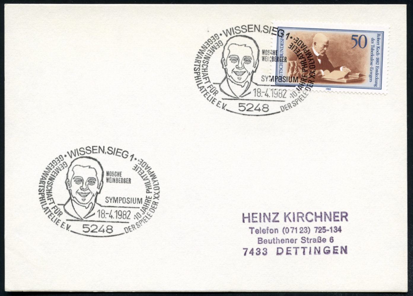 9794 | 10 € | PL-Raum 52 : 5248 WISSEN,SIEG 1/ MOSCHE/ WEINBERGER/ SYMPOSIUM.. 1982 (18.4.) SSt = Kopfbild M. Weinberger = Trainer der israel. Ringermannschaft 1972, getötet bei palästinen. Terrorakt am 5.9.197 , klar gest. Inl.-Karte (Bo.23, nur am 18.4.) | ![]() | |