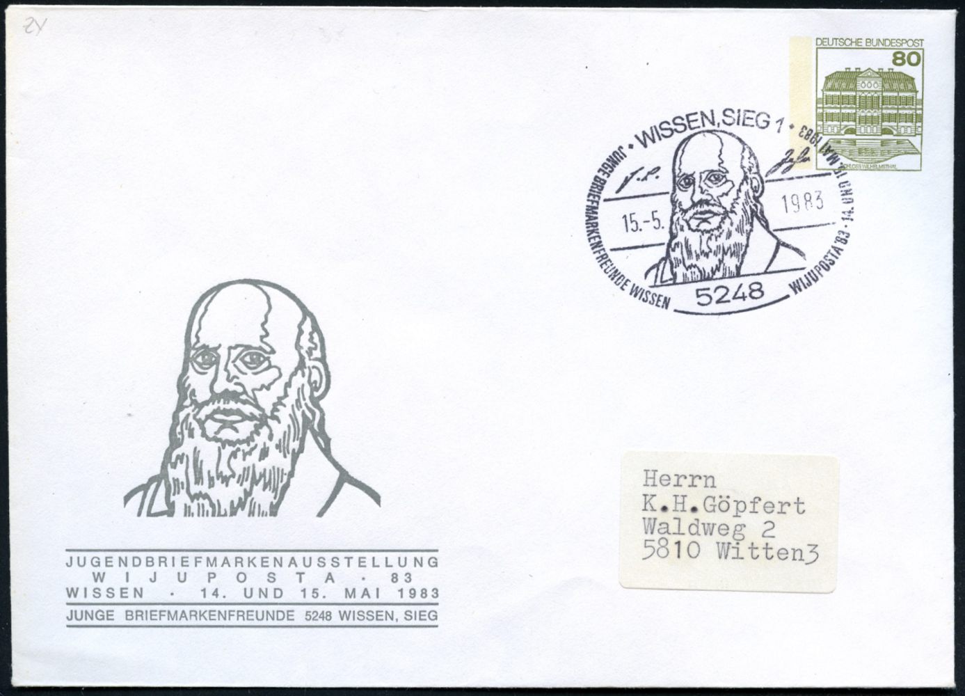 9795 | 12 € | PL-Raum 52 : 5248 WISSEN,SIEG 1/ ..WIJUPOSTA 1983 (Mai) SSt = Brustbild Jahn mit Bart , Kämpfer gegen Napoleon, Turn-Pionier, Paulskirchen-Abgeorneter 1848 etc., motivgl. PU 80 Pf. Burgen: Jahn mit Bart (Mi.PU 117) Inl.-Bf. (Bo.24) | ![]() | |