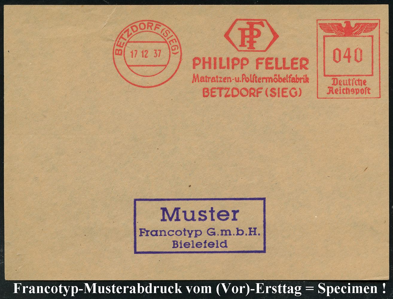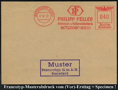 9717 | 35 € | PL-Raum 52 : BETZDORF (SIEG)/ PF/ PHILIPP FELLER/ Matratzen-u.Polstermöbelfabrik.. 1937 (17.12.) AFS-Musterabdruck Francotyp "Reichsadler" (Monogr.-Logo) glasklar gest. Francotyp-Musterblatt vom (Vor)-Ersttag !, selten! (Dü.E-5CGo) | ![]() ![]() | |