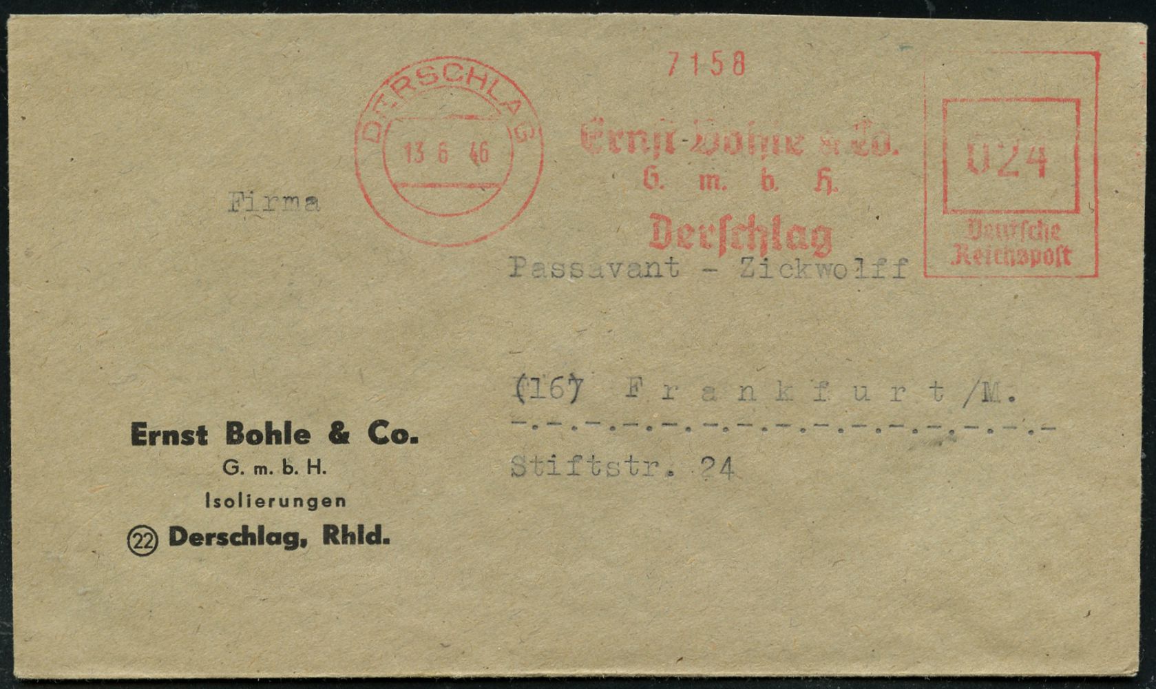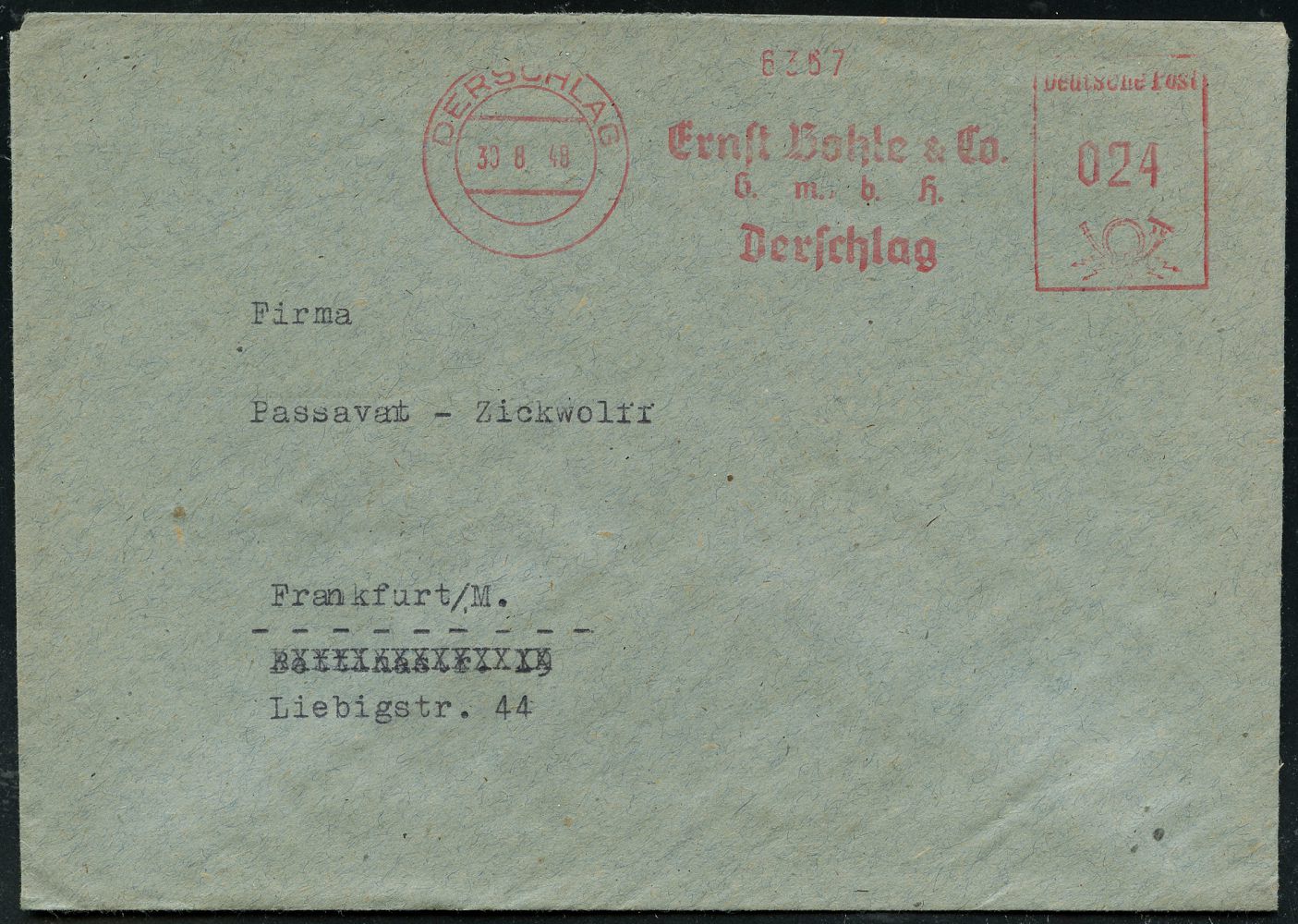 9725 | 15 € | PL-Raum 52 : DERSCHLAG/ Ernst Bohle & Co./ GmbH.. 1948 (30.8.) AFS Francotyp "Posthorn" , Fern-Bf. (Dü.E-20CGh) | ![]() | |
