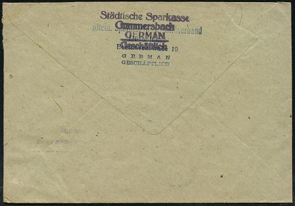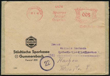 9737 | 25 € | PL-Raum 52 : GUMMERSBACH/ Sparen/ bringt/ Gewinn/ Städtische Sparkasse 1946 (10.1.) AFS Francotyp "Bogenrechteck" unverändert weiterverwendet mit Inschrift "DEUTSCHES REICH" = Notmaßnahme! , Recycling-Firmen-Bf. (doppelt verwendet, daher kleiner Klappenausriß) rs. 2 verschiedene Absender!, nachgesandter Fern-Bf. (Dü.E-1CAh, unverändert) | ![]() ![]() | |
