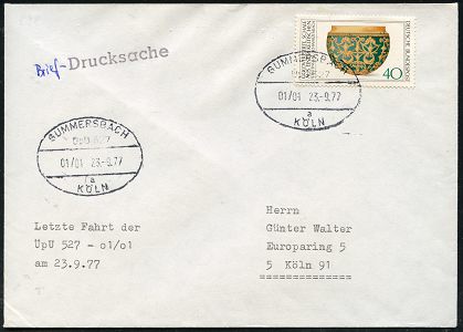 9739 | 18 € | PL-Raum 52 : GUMMERSBACH/ Ü p U 527/ 01/ 01/ a/ KÖLN 1977 (23.9.) Oval-Brücke = Mobilpostamt im Überland-Postomnibus ! + Zusatz "Letzte Fahrt der ÜpU - 010/01 am 23.9.1977", Fern-Bf. (n. Köln) | ![]() | |