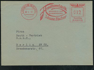 9753 | 15 € | PL-Raum 52 : LOHMAR (SIEGKR)/ Armaturenfabrik/ WERKZEUG-U./ MASCHINENBAU/ Johann Fischer 1940 (30.4.) AFS Francotyp "Reichsadler" klar auf Bedarfs-Vorderseite (Dü.E-5CGo) | ![]() | |