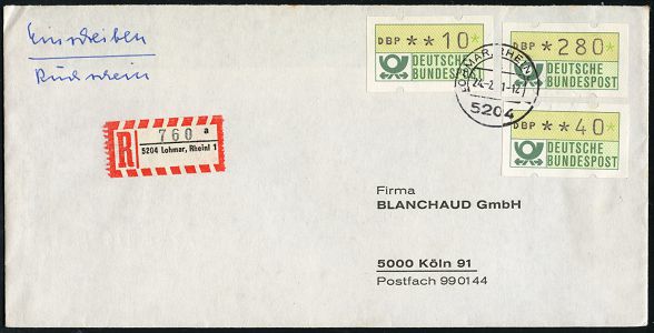 9755 | 16 € | PL-Raum 52 : 5204 LOHMAR,RHEINL 1 1981 (24.2.) 1K-Segment auf ATM 10 Pf., 40 Pf. u. 280 Pf. + RZ: 5204 Lohmr, Rheinl 1/a , klar gest. Inl.-R-Bf. "Rückschein" (Mi.ATM 1) | ![]() | |