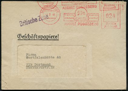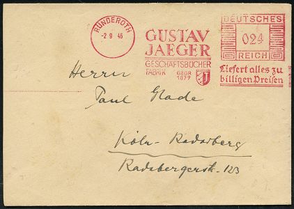 9769 | 25 € | PL-Raum 52 : RÜNDEROTH/ GUSTAV/ JAEGER/ GESCHÄFTSBÜCHER/ FABRIK.. 1946 (2.9.) AFS Francotyp "Mäanderrechteck" unverändert weiterverwendet mit Inschrift "DEUTSCHES REICH" = Notmaßnahme! (Wappen) rs. Abs.-Ra.3, Fern-Bf. n. Köln (Dü.E-2CEo, unverändert !) | ![]() | |