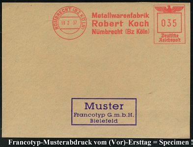 9761 | 35 € | PL-Raum 52 : NÜMBRECHT (BZ KÖLN)/ Metallwarenfabrik/ Robert Koch.. 1937 (19.2.) AFS-Musterabdruck Francotyp "Reichsadler" , glasklar gest. Francotyp-Musterblatt vom (Vor)-Ersttag !, selten! (Dü.E-5CGo) | ![]() ![]() | |