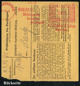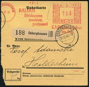 9765 | 28 € | PL-Raum 52 : OSBERGHAUSN/ BALDUS/ Strickwaren../ C.A.Baldus & Söhne.. 1942 (21.12.) AFS Francotyp "Mäanderrechteck" 114 Pf. (Ort formatbedingt nicht ganz voll) + rs. 2. Abdruck Ergänzungs-Frankatur 001 Pf. = 115 Pf. + schw. Paketzettel: Osberghausen + 2K-Steg, klar gest. Inl.-Paketkarte, seltene Portostufe! (Dü.E-2CEh, 2x !) | ![]() ![]() | |