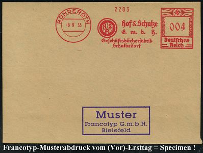 9766 | 35 € | PL-Raum 52 : RÜNDEROTH/ HSR/ Hof & Schulze/ GmbH/ Geschäftsbücherfabrik/ Schulbedarf 1935 (6.9.) AFS-Musterabdruck Francotyp "Hakenkreuz" (Monogr.-Logo) glasklar gest. Francotyp-Musterblatt vom (Vor)-Ersttag !, selten! (Dü.E-3CEh) | ![]() ![]() | |