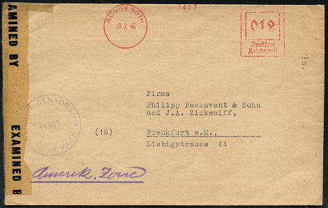 9768 | 30 € | PL-Raum 52 : RÜDEROTH 1946 (20.2.) aptierter AFS Francotyp "Reichsadler" = entfernt = Notmaßnahme!, Abs.-Klischee zusätzlich entfernt + US-Zensurstreifen "EXAMINER BY" + viol. Zensur-1K-HdN: MILITARY CENSORSHIP/ 12070/ CIVIL MAILS (= Offenbach) Inl.-Zensur-Bf., rs. Abs.-Vordruck: Schmolz & Bickenbach.. n. Ffm., vergl. Kat.-Nr. 9770-71 (Dü.E-13 J-122h) | ![]() ![]() | |