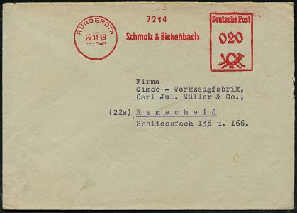 9771 | 16 € | PL-Raum 52 : RÜNDEROTH/ Schmolz & Bickenbach 1949 (22.11.) AFS Francotyp "Posthorn" , rs. Abs.-Vordrucl, Fern-Bf. (Dü.E-20BAh) | ![]() ![]() | |