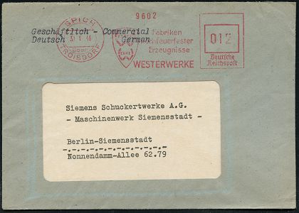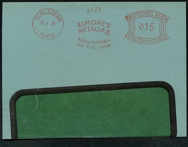 9772 | 15 € | PL-Raum 52 : SCHLADEN/ (SIEG)/ ELMORE´S/ METALL-A.G./ Natlos-Kupferrohre.. 1931 (16.4.) AFS Francotyp "Bogenrechteck" klar auf Teil-Vorderseite (Dü.E-1CEh) | ![]() | |