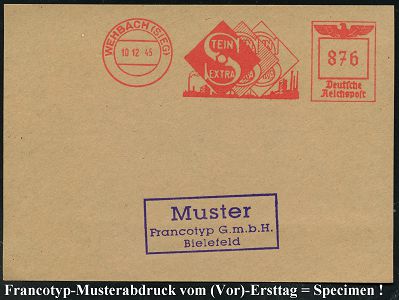 9784 | 35 € | PL-Raum 52 : WEHBACH (SIEG)/ STEIN/ EXTRA 1935 (10.12.) AFS-Musterabdruck Francotyp "Reichsadler", Stempelirrtum Jahreszahl "1945" (Monogr.-Logo mit Industrie-Anlagen) glasklar gest. Francotyp-Musterblatt vo (Vor)-Ersttag !, selten! (Dü.E-CGo) | ![]() ![]() | |
