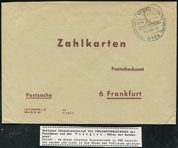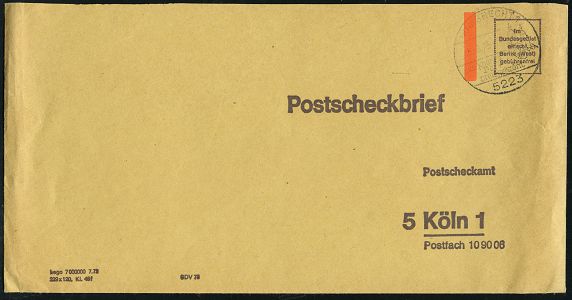 9762 | 18 € | PL-Raum 52 : 5223 NÜMBRECHT 1/ Als schönstes/ Dorf/ preisgekrönt 1975 (15.8.) HWSt (2 Türme) gelber PSch-Innendienstbf., Langformat mit orange Lumo-Balken "PSch-Amt 5 Köln 1", = Postautomation!, seltener Beleg! (Bo.1 Ty.II) | ![]() | |