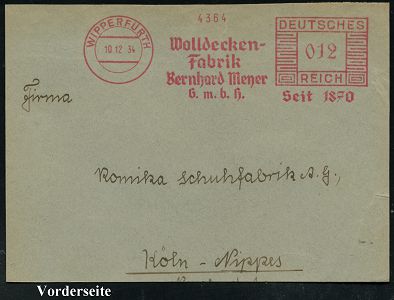 9790 | 15 € | PL-Raum 52 : WIPPERFÜRTH/ Wolldecken-/ Fabrik/ Bernhard Meyer/ GmbH/ Seit 1870 1934 (10.12.) AFS Francotyp "Mäanderrechteck" auf Bedarfs-Vorderseite (Dü.E-2CEh) | ![]() | |