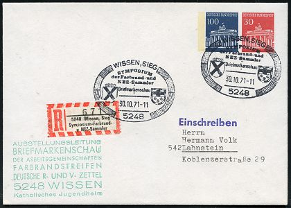 9791 | 29 € | PL-Raum 52 : 5248 WISSEN,SIEG/ SYMPOSIUM/ der Farbrand-u./ NEZ-Sammler.. 1971 (30.10.) SSt (Wappen) + Sonder-RZ: 5248 Wissen, Sieg/ Symposium.Farbrand-/u NEZ.Sammler (NEZ-Kat. Nr.205) auf PU 100 Pf. + 30 Pf. Brandenbg. Tor (Mi.PU 45/1) + Abs.-7L: AUSSTELLUNGSLEITUNG.. Katholisches Jugendheim, klar gest. Inl.-R-Bf. + R-Einl.-Schein, 2 Belege kompl.! | ![]() ![]() | |