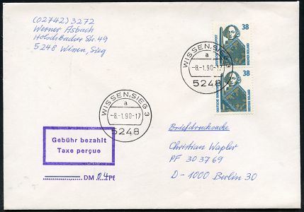 9798 | 25 € | PL-Raum 52 : 5248 WISSEN,SIEG 3/ a 1990 (8.1.) 1K-Segment auf senkr. Paar 38 Pf. Roland = MeF + Bar-Ergänzungs-Frankatur "Gebühr bezahlt/ Taxe percue" 04 Pf. klar gest. portorichtige Inl.-Briefdruchsache = seltene Frankatur (Mi.1400 A, MeF + 50.- EUR) | ![]() | |
