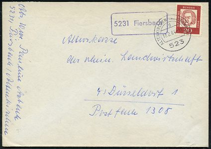 9734 | 12 € | PL-Raum 52 : 5231 Fiersbach 1964 (17.2.) viol. Ra = PSt.II + 1K-Segment: 523 ALTENKIRCHEN (WESTERWALD)/g klar gest. Fernbf. (Mi.352 EF) | ![]() | |