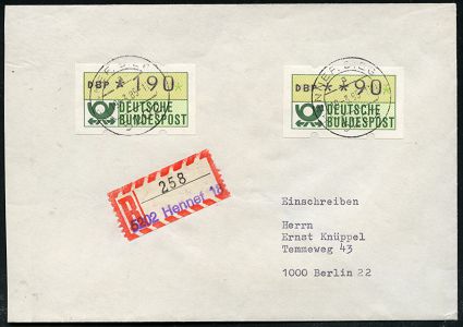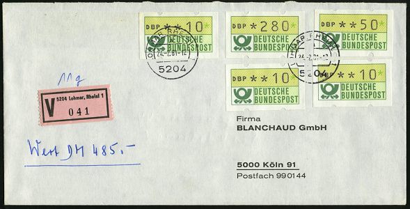 9754 | 18 € | PL-Raum 52 : 5204 LOHMAR, RHEINL 1/ a 1981 (24.2.) 1K-Segment auf ATM 3x 10 Pf., 50 Pf. u. 280 Pf. + rosa V-Zettel: 5204 Lohmar, Rheinl 1 , sauber gest. Inl.-Wertbf. 485.- DM n. Köln, rs. AS. (Mi.ATM 1 I) | ![]() | |