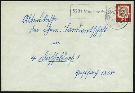 9759 | 12 € | PL-Raum 52 : 5231 Maulsbach 1964 (15.2.) schw.-viol. Ra = PSt.II + 1K-Segment: 523 ALTENKIRCHEN (WESTERWALD)/g , klar gest.Fernbf. (Mi.352 EF) | ![]() | |