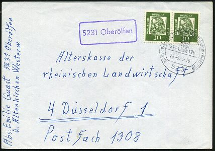 9763 | 12 € | PL-Raum 52 : 5231 Oberölfen 1964 (26.3.) viol. Ra. = PSt.II + HWSt: 523 ALTENKIRCHEN (WESTERWALD)/..850 Jahre , Fernbf. (Bo.5, Erstjahr) | ![]() | |