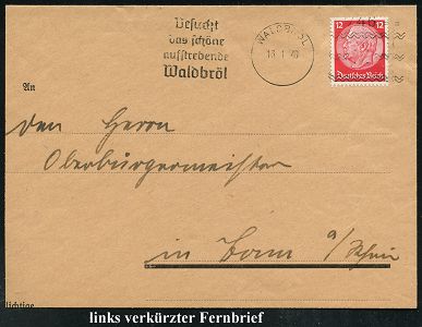 9780 | 30 € | PL-Raum 52 : WALDBRÖL/ =746=/ Besucht/ d.schöne/ aufstrebende/ Waldbröl 1940 (19.1.) Freimarkenstempel = Frankierautomat zur Vorausentwertung (der Fa. Telefonbau & Normalzeit, Ffm) klar auf EF 12 Pf. Hindenbg., Fern-Bf. (links verkürzt) n. Bonn, selten! (Mi.519 EF) | ![]() | |