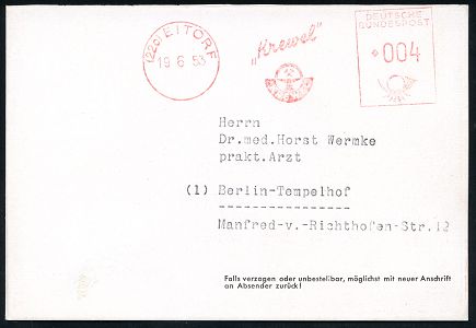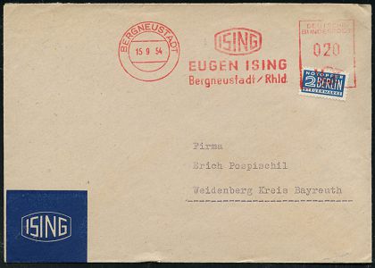 9714 | 15 € | PL-Raum 52 : BERGNEUSTADT/ ISING/ EUGEN ISING 1954 (15.9.) AFS Francotyp "Posthorn" auf 2 Pf. NoB (= Vorausentwertung) rs. Abs.-Vordruck, vs. Firmen-Logo, Firmen-Bf. (Dü.E-23CG) | ![]() | |