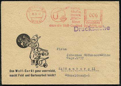 9718 | 28 € | PL-Raum 52 : BETZDORF/ (SIEG)/ ..Nimm/ dazu die Wolf-Geräte 1947 (22.5.) seltener, aptierter AFS Francotyp "Hakenkreuz" = entfernt = Notmaßnahme! (Hacke, Logo: Wolf) zeitbedingt etw. schwach,dekorativer Reklame-Bf.: Das Wolf-Gerät.. (Dü.E-12 K-83 Bo) | ![]() | |