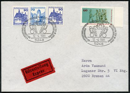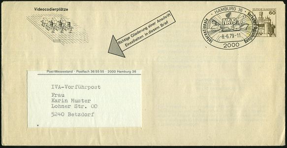 9719 | 16 € | PL-Raum 52 : 5240 Betzdorf 1979 (8.6.) postamtl. U 60 Pf. Burgen, Vorführ-Umschlag IVA, Hamburg: Videocodierplätze + Buchdruck-SSt.: 2000 HAMBURG 36/I V A.. (Verkehrsmittel der Zukunft) ohne Codierung + Inhalt: IVA-Vordführpost, Vorführ-Bf. für PLZ 5240 Betzdorf ! (ME.U III) | ![]() | |