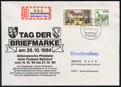 9720 | 18 € | PL-Raum 52 : 5240 BETZDORF,SIEG 1/ h 1984 (18.10.) 1K-Segment auf 80 Pf. Tag d.Briefmarke (Mi.1229 = FDC) etc. + provis. Sonder-RZ: Aktionswoche Philatelie/ 5240 Betzdorf-Sieg 1, Inl.-Sonderumschlag: Tag d.Briefmarke, Fern-R-Bf. | ![]() | |