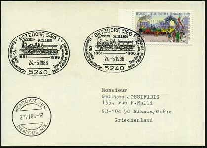 9721 | 11 € | PL-Raum 52 : 5240 BETZDORF,SIEG 1/ 125 Jahre/ Eisenbahn an Sieg u.Heller.. 1986 (24.5.) SSt = histor. Lok mit Tender , EF 80 Pf. "150 Jahre Deutsche Eisenbahnen" (Mi.1264) klar gest. Ausl.-Karte, seltene Kombination! | ![]() | |