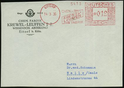 9727 | 15 € | PL-Raum 52 : EITORF/ CHEM,./ FABRIK/ KREWEL-/ LEUFFEN 1936 (14.3.) AFS Francotyp "Mäanderrechteck" auf Firmen-Vorderseite (Dü.E-2Ah) | ![]() | |