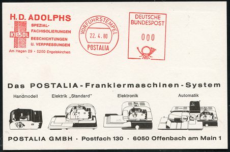 9733 | 18 € | PL-Raum 52 : 5250 Engelskirchen 1980 (22.4.) AFS: VORFÜHRSTEMPEL/POSTALIA/H.D.ADOLPHS/..FACHISOLIERUNGEN/BESCHICHTUNGEN/U.VERPRESSUNGEN/KIESOL.. (Mauer m.Isoliermaterial) seltene Postalia-Musterkarte (= Specimen) | ![]() | |
