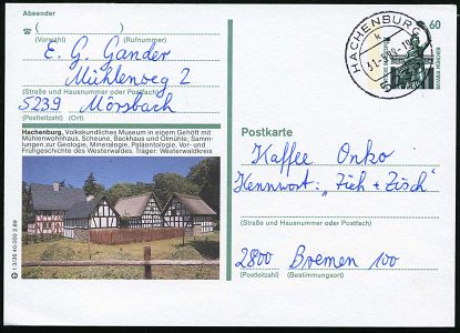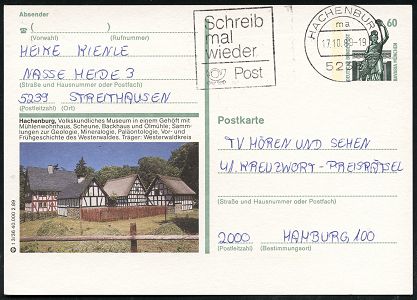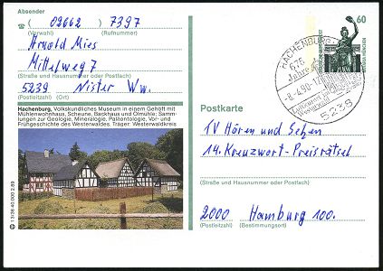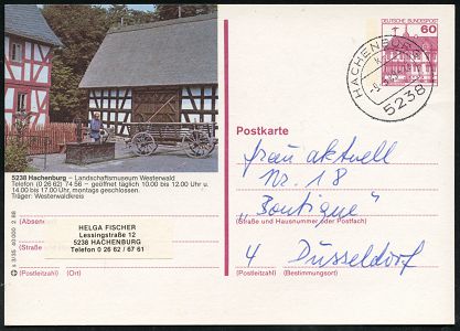 9743 | 12 € | PL-Raum 52 : 5238 HACHENBURG/ ma/ Schreib/ mal/ wieder/ Post 1989 (17.10.) MWSt auf ortsgleicher BiP 60 Pf. Bavaria: Hachenburg, Volkskundliches Museum.. (Museumsdorf, Agrarmuseum) Bedarf !, seltene Kombination! (Mi.P 152/t 3-36) | ![]() | |