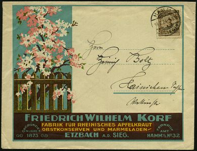 9746 | 25 € | PL-Raum 52 : HAMM/ (SIEG)/ a 1924 (10.2.) 1K-Gitter auf Color-Reklame-Bf.: F. W. KORF, FABRIK FÜR RHEIN. APFELKRAUT OBSTKONSERVEN U. MARMELADEN.. (blühender Obstbaum) Fern-Bf. (Mi.338 EF) | ![]() | |