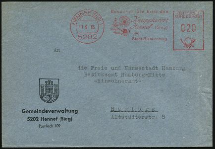 9749 | 10 € | PL-Raum 52 : 5202 HENNEF (SIEG) 1/ ..Kneippkurort../ und/ Stadt Blankenburg 1965 (11.9.) AFS Francotyp = Kneipp-Kanne etc. , Kommunal-Bf. mit Wappen (Dü.E-23CO) | ![]() | |