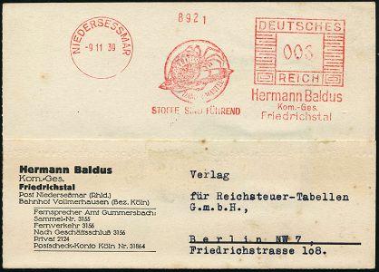 9760 | 25 € | PL-Raum 52 : NIEDERSESSMAR/ ..Hermann Baldus/ Kom.Ges. 1939 (9.11.) dekorativer AFS Francotyp "Mäanderrechteck" (Spinne auf Weberschiffchen) Firmen-Fernkt., seltenes Motiv! (Dü.E-2CEh) | ![]() | |