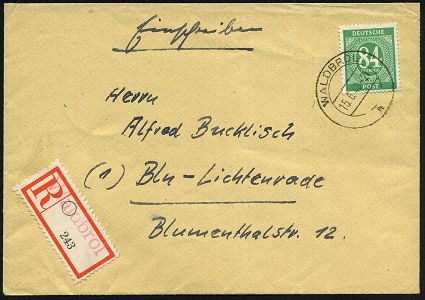 9781 | 15 € | PL-Raum 52 : WALDBRÖL/ a 1948 (15.6.) 2K-Steg auf EF 84 Pf. Ziffer + provis. RZ: Waldbröl = roter 1L auf gez. Blanco-RZ mit PLGZ-Kreis , Fern-R-Bf. n. West-Berlin, rs. AS. (Mi.936 EF + 8.- EUR) | ![]() | |