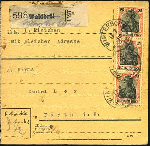 9789 | 20 € | PL-Raum 52 : WINTERBORN/ ** 1919 (17.7.) nachverwendeter, alter 1K auf senkr. 3er-Streifen 25 Pf. Germania + provis. Paketzettel: Waldbröl (gestrichen) + hs. Winterborn ergänzt (Leimfleck) Inl.-Paketkarte n. Fürth (Mi.88 II, /MeF) | ![]() | |