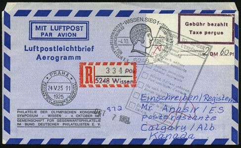 9793 | 25 € | PL-Raum 52 : 5248 WISSEN,SIEG 1/ SYMPOSIUM PHILAT./ DER OLYMP.KONGRESSE 1981 (4.10.) SSt (griech. Athletenkopf) Sonder-Aerogramm "PRAHA 1925" + Label "Gebühr bezahlt/Taxe percue" (260 Pf.) + Sonder-RZ: 5248 Wissen/p o k (NEZ-Nr. 341 = Philatelie Olymp. Kongresse), Retour-Übersee-Flp.-R-Bf.! (Bo.18) | ![]() | |