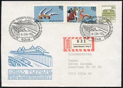 9796 | 16 € | PL-Raum 52 : 5248 WISSEN,SIEG 3/ ..OLYMBRIA´84 1984 (8.2.) SSt = Bobbahn mit Zweierbob auf motivgl. PU 80 Pf. Burgen, oliv (Mi.PU 117) + Zusatzfrankatatur "Sporthilfe" + RZ: 5248 Wissen, Sieg 3, klar gest. Inl.-R-Bf. (Bo.25) | ![]() | |