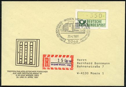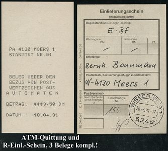 9799 | 18 € | PL-Raum 52 : 5248 WISSEN,SIEG1/ ..DEUTSCHLANDIA´91 1991 (20.4.) SSt (R-Automat) auf EF ATM 350 Pf. + provis. Sonder-RZ: W-5248 Wissen. Sieg 1/D ´91 + ATM-Quittung u. R-Einl.Schein, klar gest. Inl.-R-SU, 3 Belege kompl.! (Mi.1) | ![]() ![]() | |