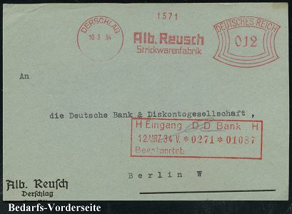 9723 | 14 € | PL-Raum 52 : DERSCHLAG/ Alb.Reusch/ Strickwarenfabik 1934 (10.3.) AFS Francotyp "Bogenrechteck" auf kleiner Firmen-Vorderseite (Dü.E-1CEh) | ![]() | |