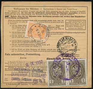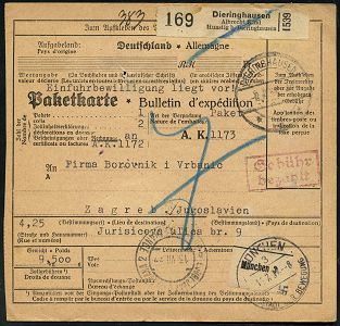 9726 | 25 € | PL-Raum 52 : DIERINGHAUSEN/ *a* 1937 (8.7.) 1K-Brücke + viol. Ra.2: Gebühr/bezahlt + schw. Selbstbucher-Paketzettel: Dieringhausen/ Albrecht Kind/Hunstig b Dieringhausen + Leitzettel; München 3 etc., Ausl.-Selbstbucher-Paketkarte (mittig kl. Kerbe) n. Zagreb, rs. jugoslaw. Fiskal- u. Portomarken | ![]() ![]() | |