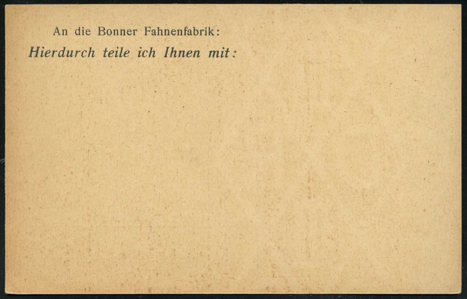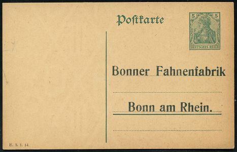 9805 | 18 € | 5300 BONN (Allgem. Belege, Tagesstempel, Ganzsachen etc.) : Bonn 1914 amtl. P 5 Pf. Germania "Deutsches Reich", grü mit zweiseitigem Firmen-Zudruck: Bonner Fahnenfabrik , ungebr., vergl. Kat.-Nr.9802 (Mi.PZD 90) | ![]() ![]() | |