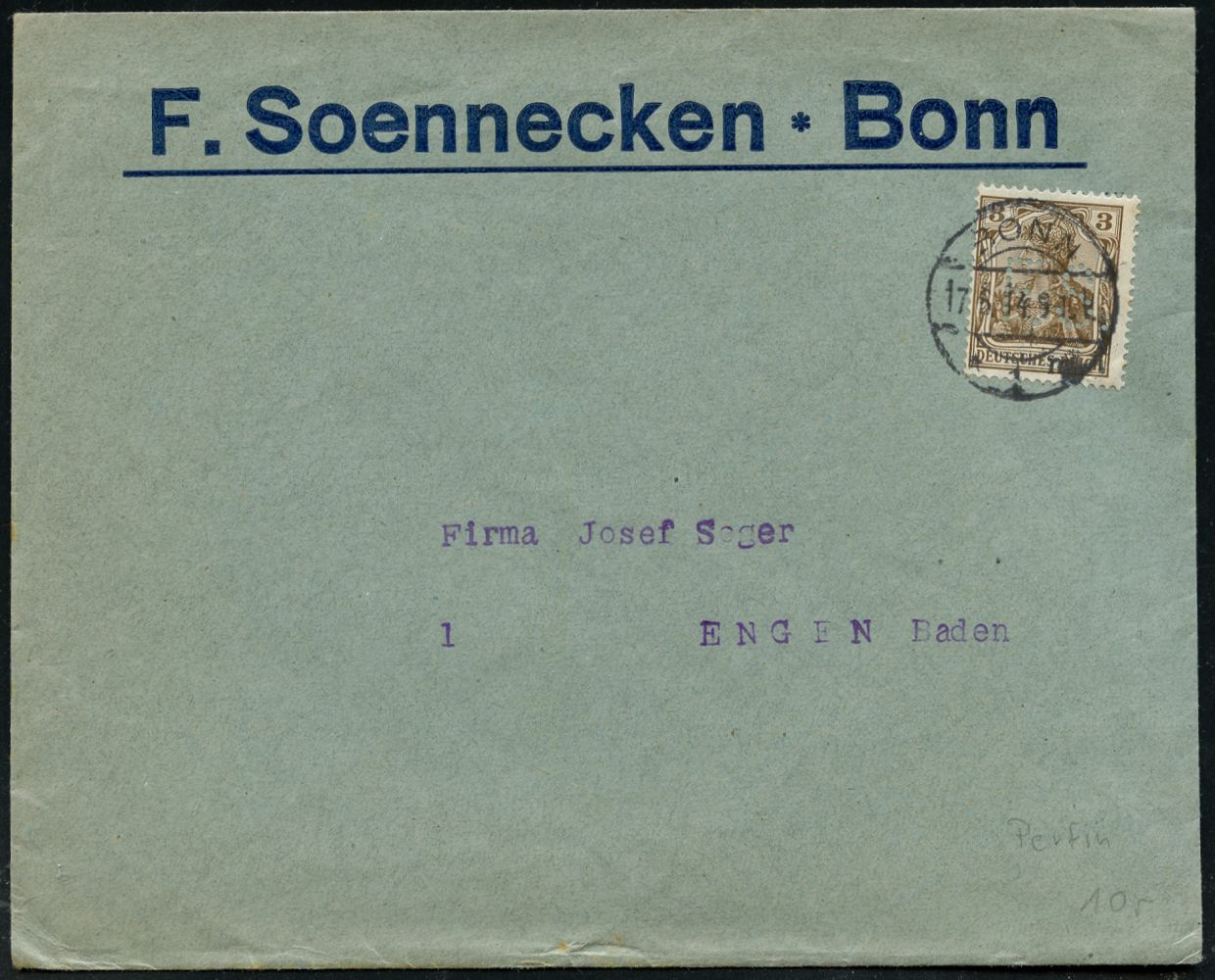 9806 | 15 € | 5300 BONN (Allgem. Belege, Tagesstempel, Ganzsachen etc.) : BONN/ *1n 1914 (17.5.) 1K-Brücke auf EF 3 Pf. Germania mit Firmenlochung "F S" = F. S oennecken (Bürobedarf) Firmen-Drs.-Bf. (Mi.84 I, EF Perfin) | ![]() | |
